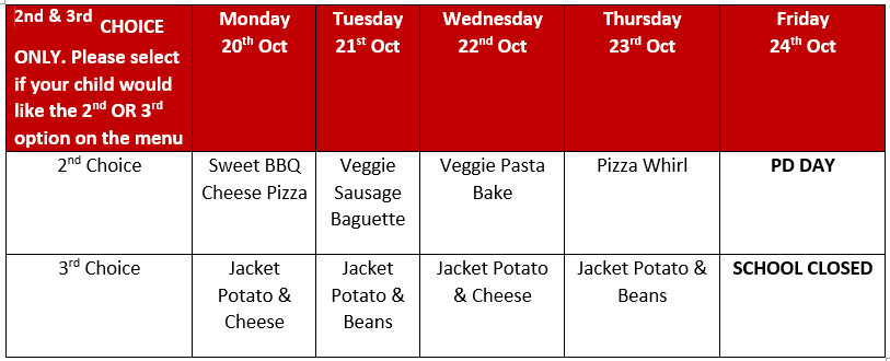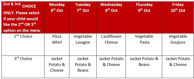 We are now introducing a 2nd & 3rd option for school dinners. This will give the children a jacket potato each day, should they want one. Parents will be required to sign their child up for the 2nd or 3rd option (usually includes a vegetarian option) for school meals via the website. The main option does not need to be signed up for. Parents should speak to their child about the menu, and then sign up for each day. Children are allowed to bring their own packed lunch, if they want to.
