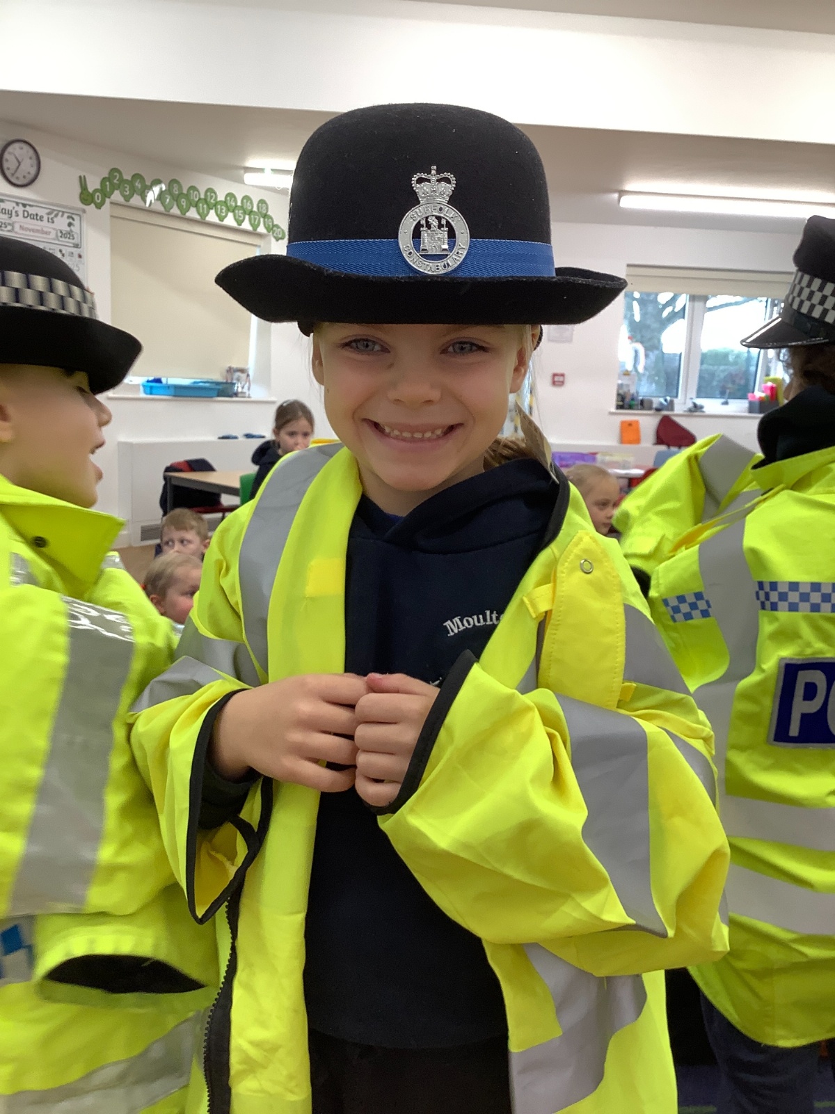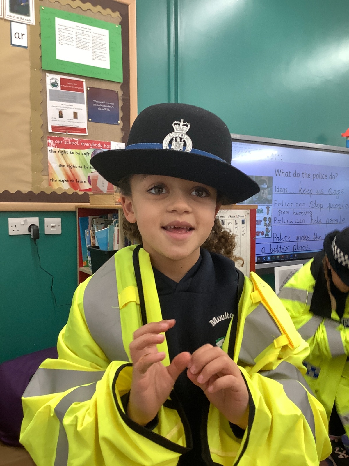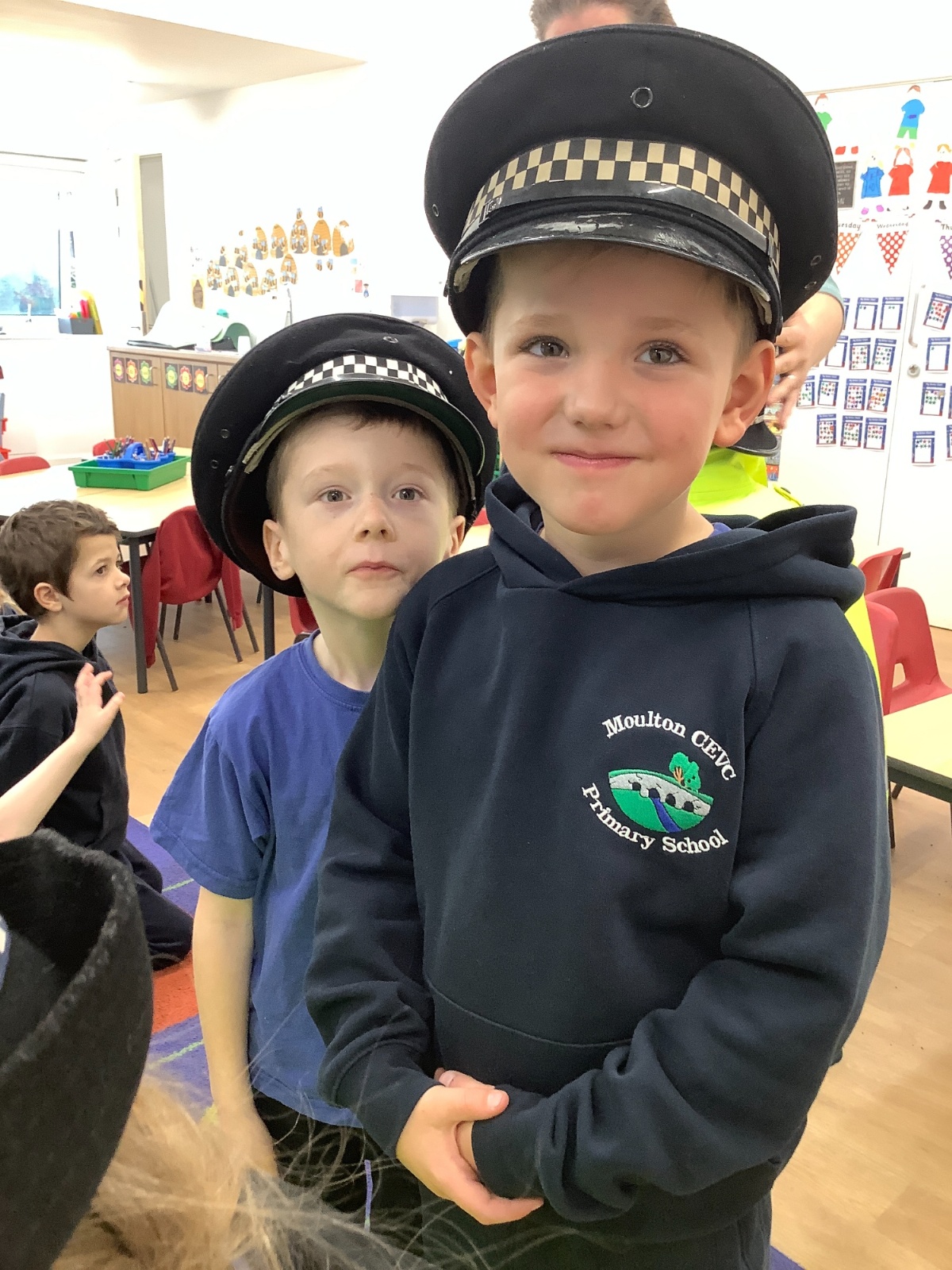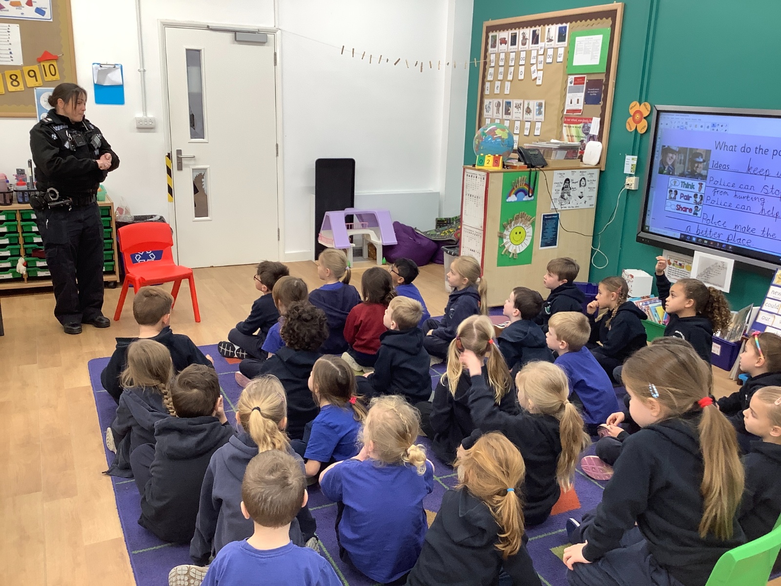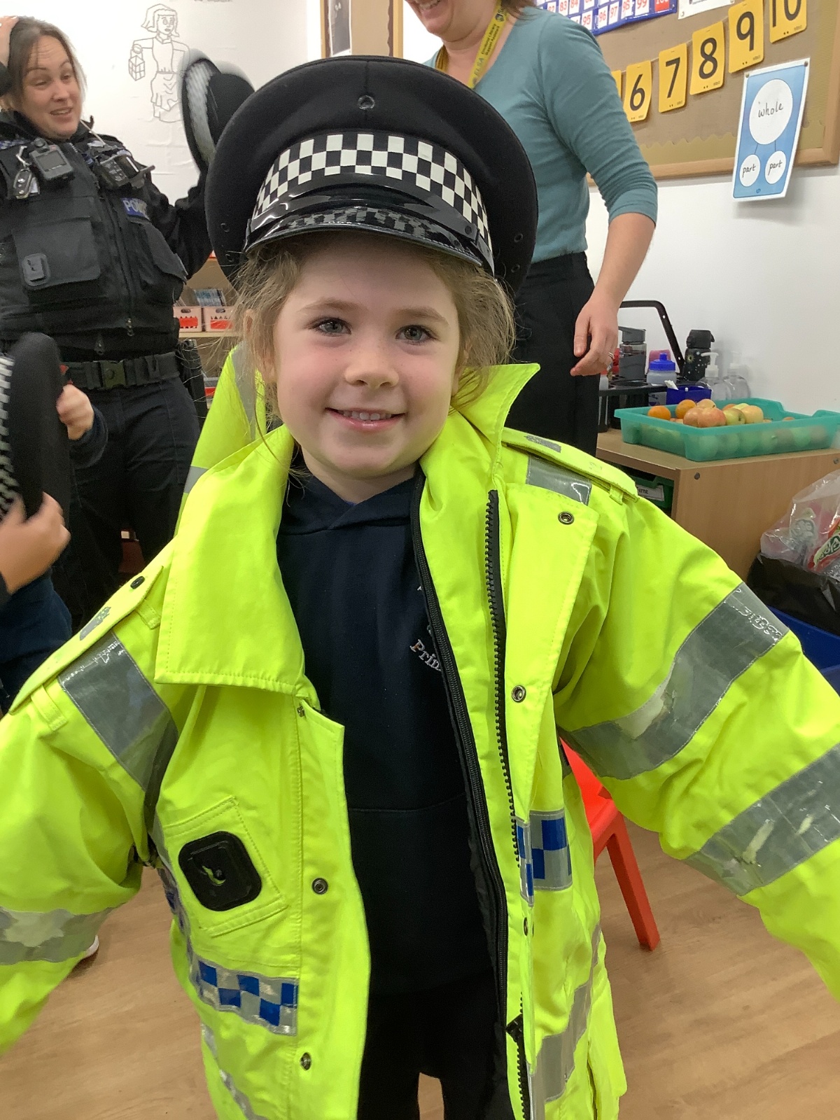 Our year 1 class had a very special visitor this week. A police officer with her car and uniform for the children to try on. She spent time explaining about the different hats and helmets the police wear and how to turn the sirens on in the car!! It was a rather noisy session out in the playground!